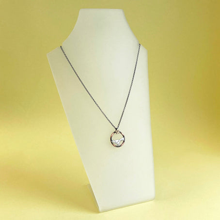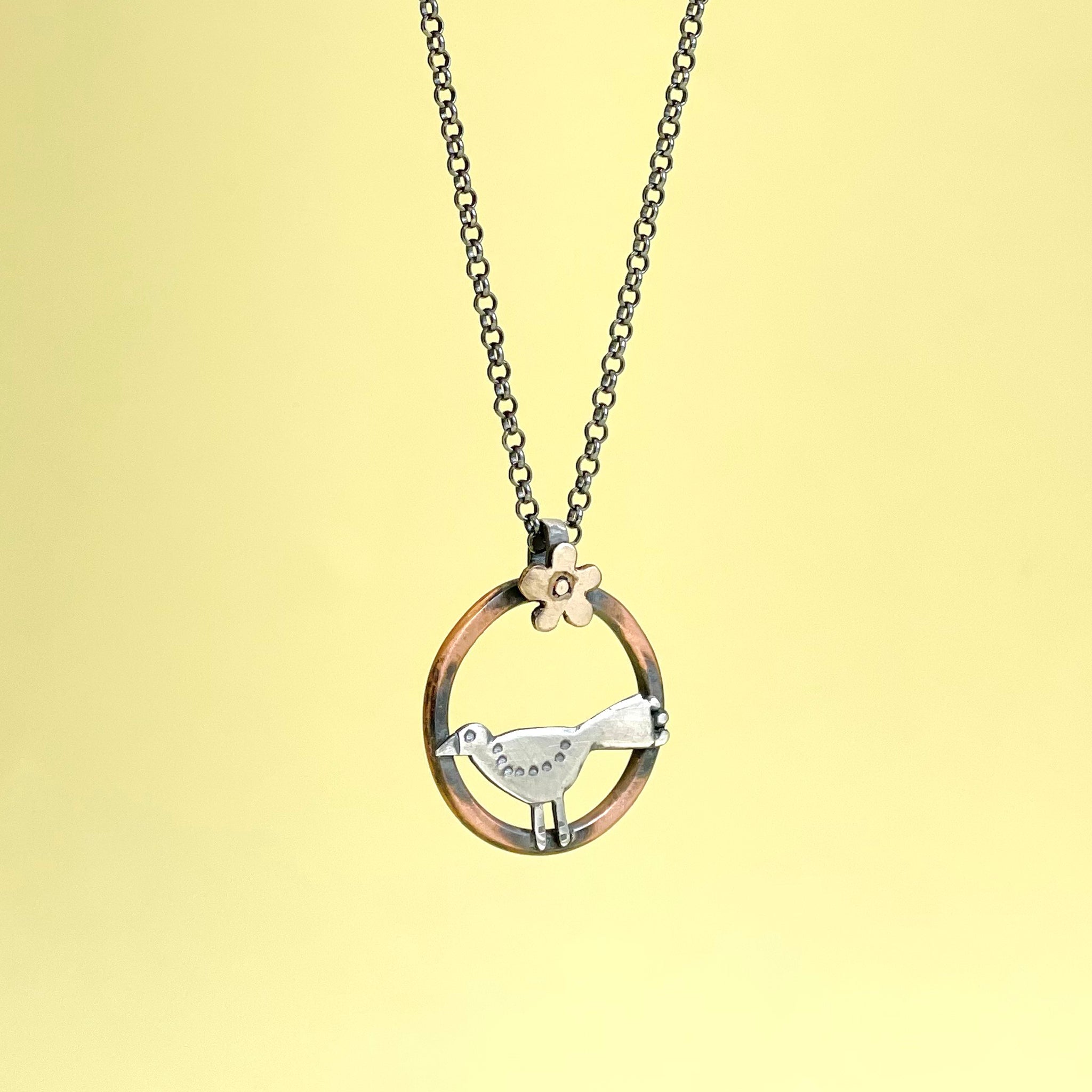 Stylised handmade silver bird, standing in a copper hoop and finished with a bronze flower detail.