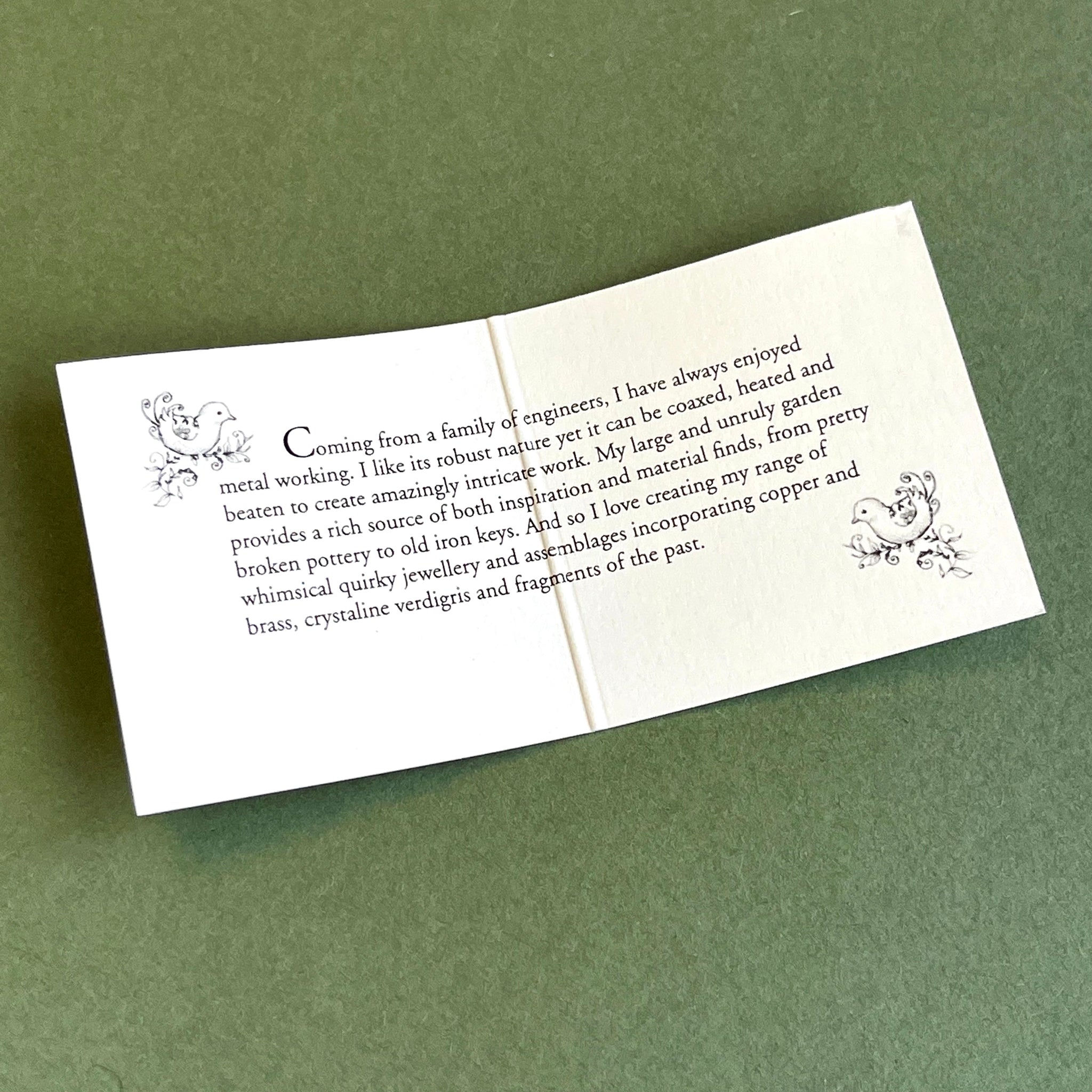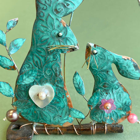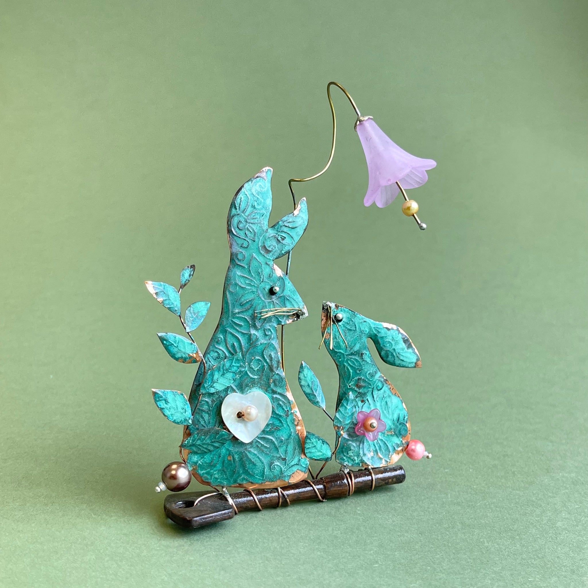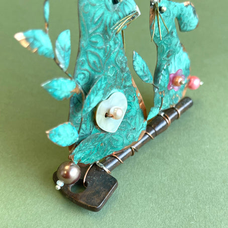 This pair of little rabbits sit amongst some foliage and under a flower, made from embossed copper with vintage buttons and bead details and mounted on a vintage key. Freestanding. Comes presented in a gift box.