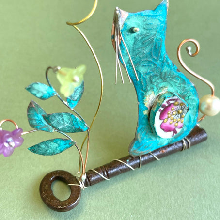 This cat is sitting pretty beside a flower and keeping a close eye on a tiny bird. Made from embossed copper with a vintage china detail and mounted on a vintage key. Freestanding. Comes presented in a gift box.