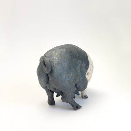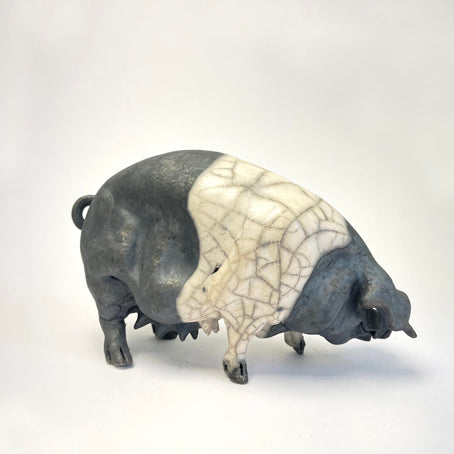 Beautifully observed and hand modelled trotting, saddleback, raku ceramic pig. Each piece is unique. The crackle glaze adding to the character of each piece.