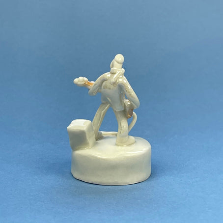 A hand made ceramic sculpture of a dude and his guitar. Beautifully modelled in porcelain with each piece being fired 3 times. Details picked out with a bright lustre finish. Each piece is slightly different.