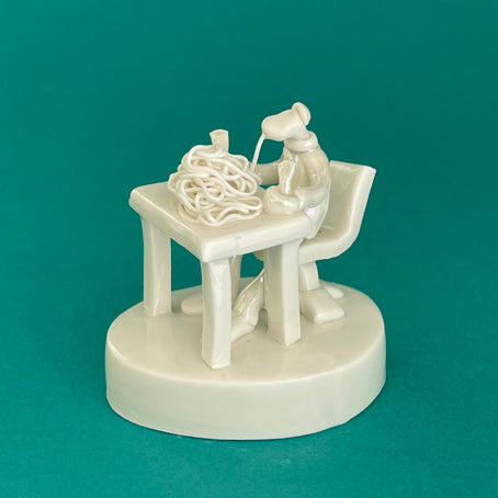 A hand made ceramic sculpture of a guy sucking up a big plate of pasta. Mamma mia! Beautifully modelled in porcelain with each piece being fired 3 times. Details picked out with a bright lustre finish. Each piece is slightly different.
