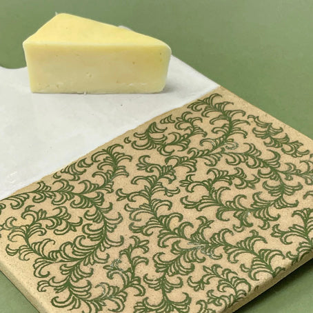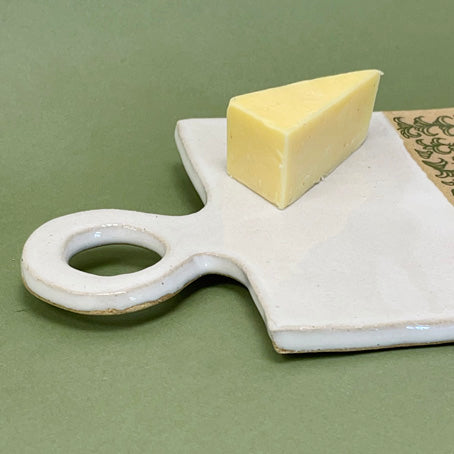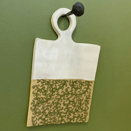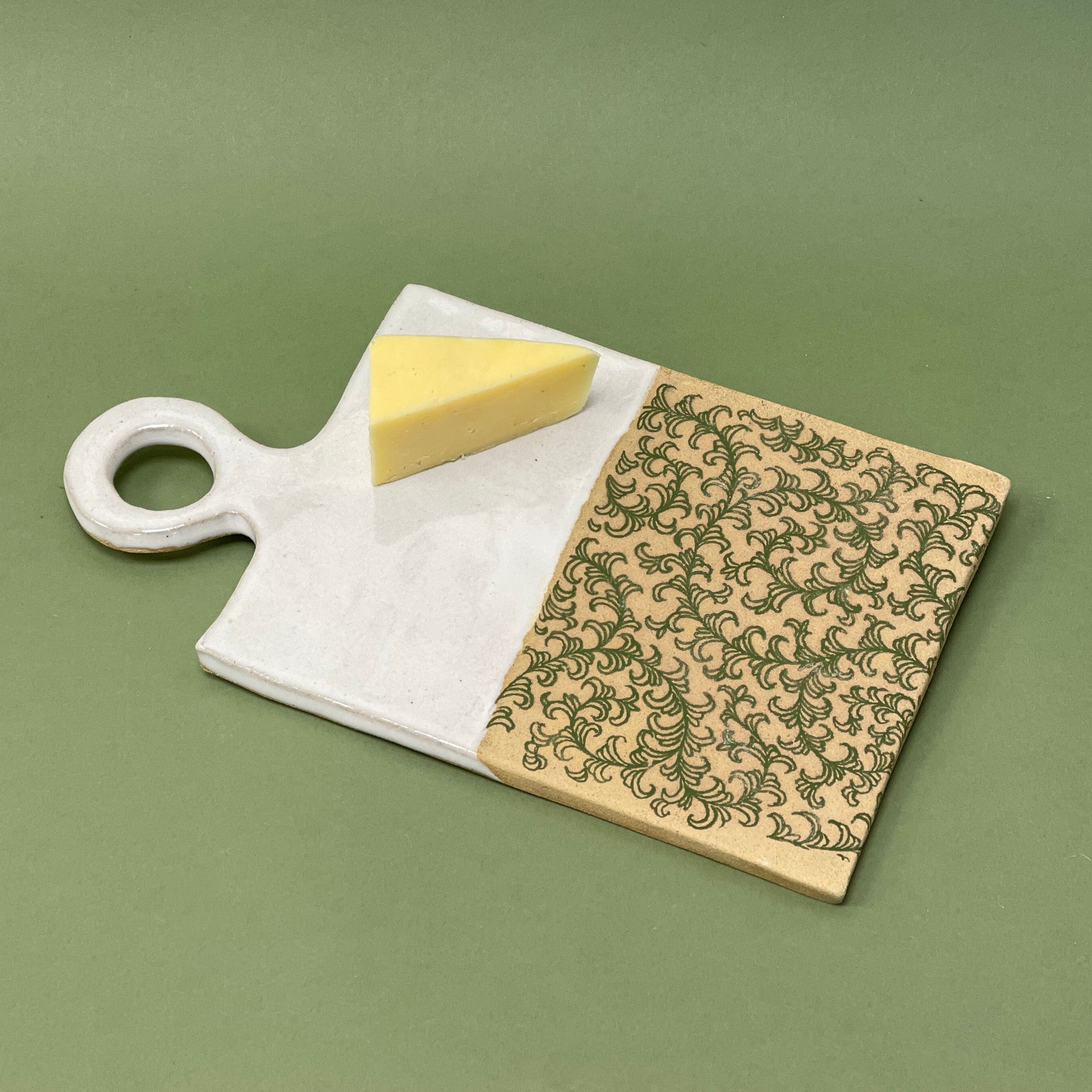 These are beautifully made ceramic boards, perfect for display or use as a cheese board. Half glazed in white and the other half with a complimentary pattern on the natural stoneware.