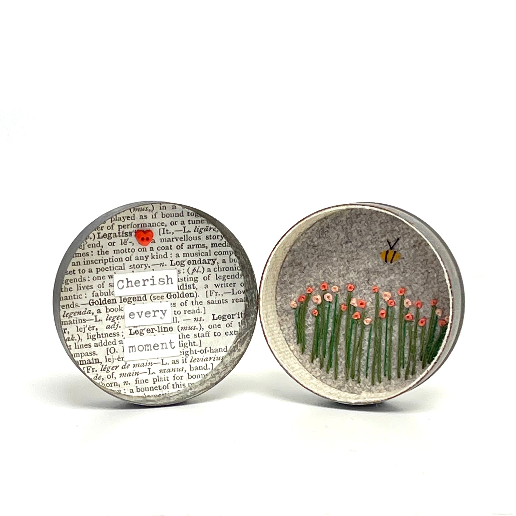 This unique collage keepsake created inside a vintage snuff tin where you will find a hand embroidered flower scene.