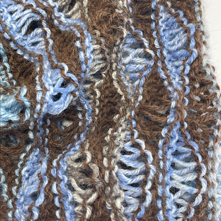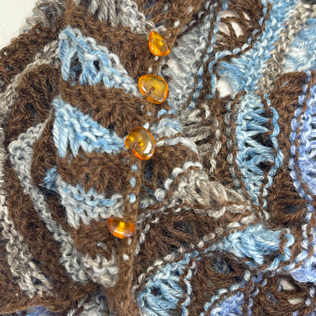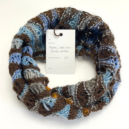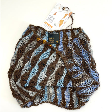 These are a little special, hand knitted in Copenhagen, Denmark. They draw colour and pattern inspiration from the rugged coastline. They are light to wear and suitable for all seasons. Cosy in the winter tucked in around a coat collar or worn with a long sleeved t-shirt in an air conditioned room. Ticks all the boxes.