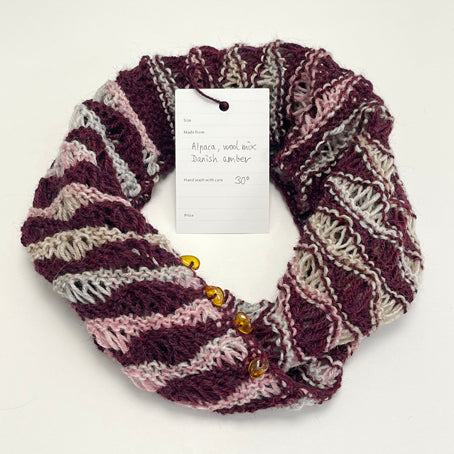 These are a little special, hand knitted in Copenhagen, Denmark. They draw colour and pattern inspiration from the rugged coastline. They are light to wear and suitable for all seasons. Cosy in the winter tucked in around a coat collar or worn with a long sleeved t-shirt in an air conditioned room. Ticks all the boxes.