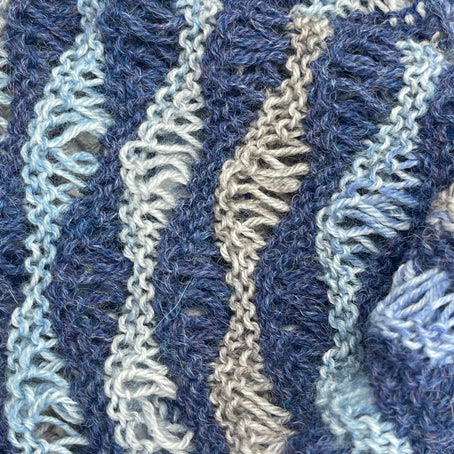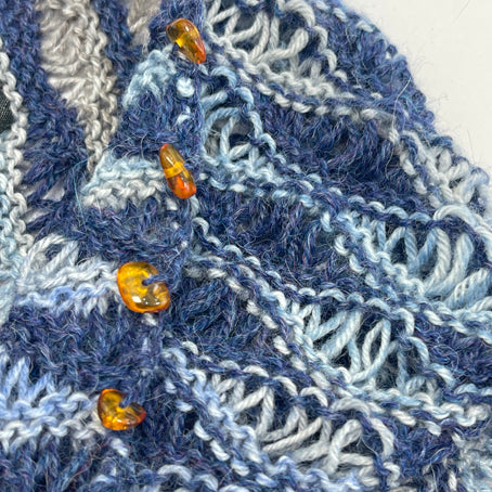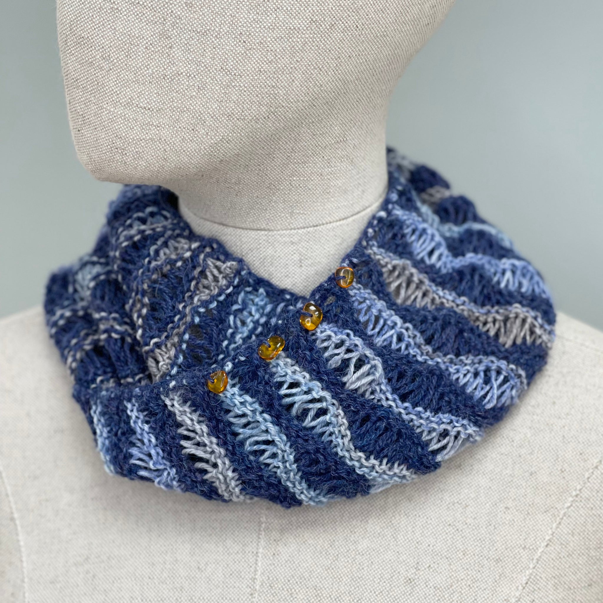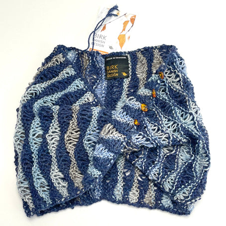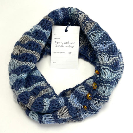 These are a little special, hand knitted in Copenhagen, Denmark. They draw colour and pattern inspiration from the rugged coastline. They are light to wear and suitable for all seasons. Cosy in the winter tucked in around a coat collar or worn with a long sleeved t-shirt in an air conditioned room. Ticks all the boxes.
