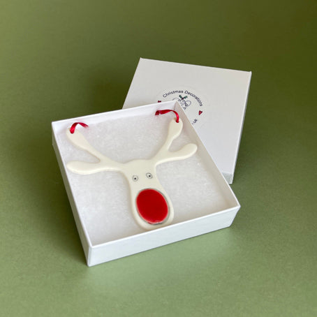 A fine porcelain, hand made, Rudolph the reindeer decoration with his famous red nose. Comes ready to hang with a ribbon and presented in its own gift box.