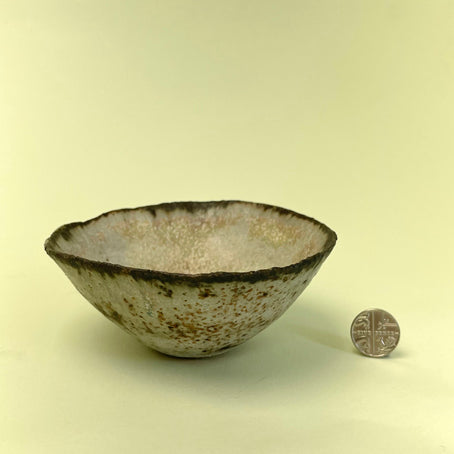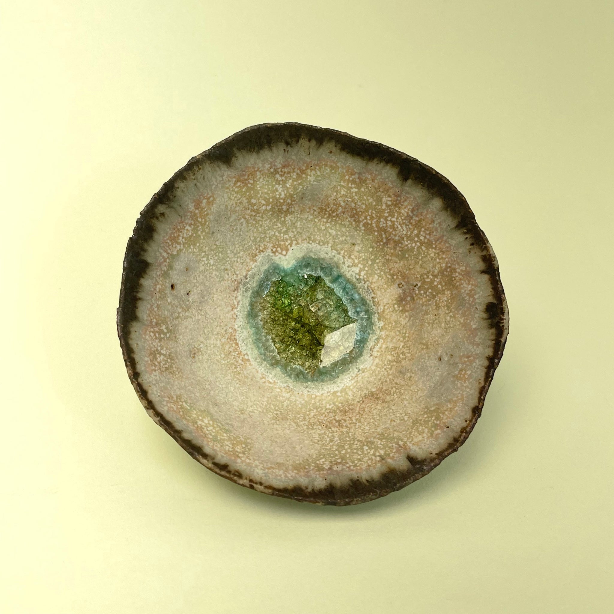 Hand built decorative bowl made from coarse-textured, stoneware clay with found sea glass details.