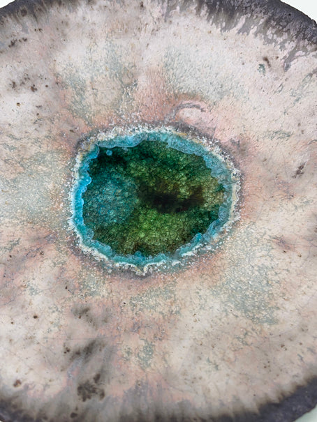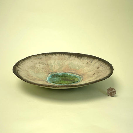 Hand built decorative bowl made from coarse-textured, stoneware clay with found sea glass details.