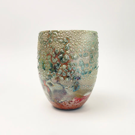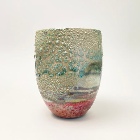 A hand made ceramic vase using a 2 glaze technique know as 'dragon glaze'. This makes each piece unique resulting in a enchanting surface texture and deep copper coloured details.