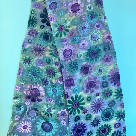 This is a traditionally made, hand painted 'devoré' velvet scarf - coming from the French verb 'to devour'. Using a chemical process to dissolve the viscose velvet fibres, this leaves a semi-transparent pattern against the more solidly woven fabric. Popular in the 1920's and revived in the 1980s by Jasper Conran it still looks, feels and wears beautifully today.