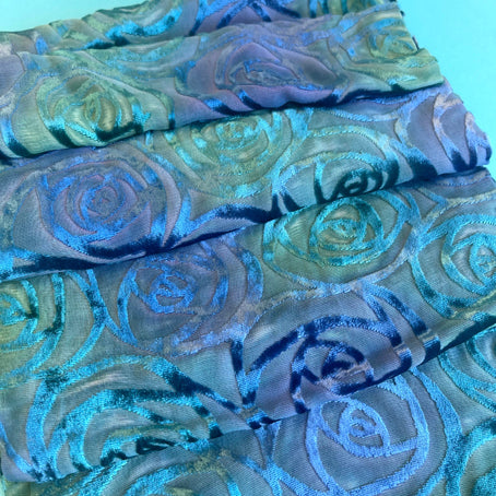 This is a traditionally made, hand painted 'devoré' velvet scarf - coming from the French verb 'to devour'. Using a chemical process to dissolve the viscose velvet fibres, this leaves a semi-transparent pattern against the more solidly woven fabric. Popular in the 1920's and revived in the 1980s by Jasper Conran it still looks, feels and wears beautifully today.