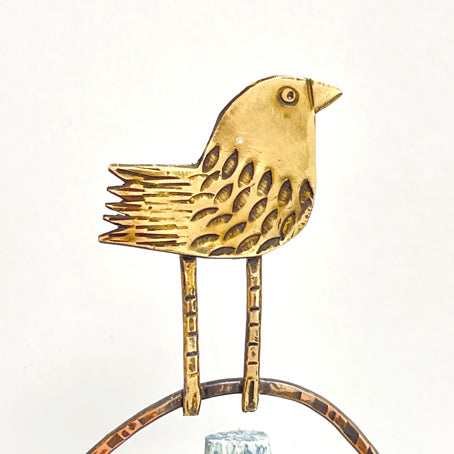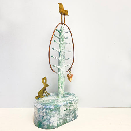This cute little bird is perched on top of a tree and a hare underneath - hand made from brass and copper on a hand painted wooden tree and base.