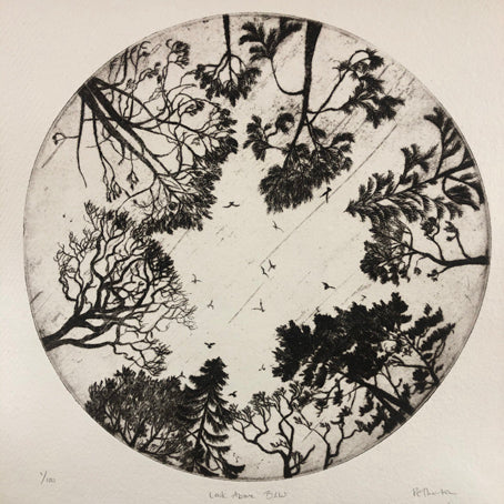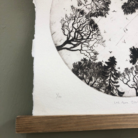 Hand printed paper print using dry point etching technique. The print is held between 2 pieces of wood allowing the edged of the watercolour paper to be visible.