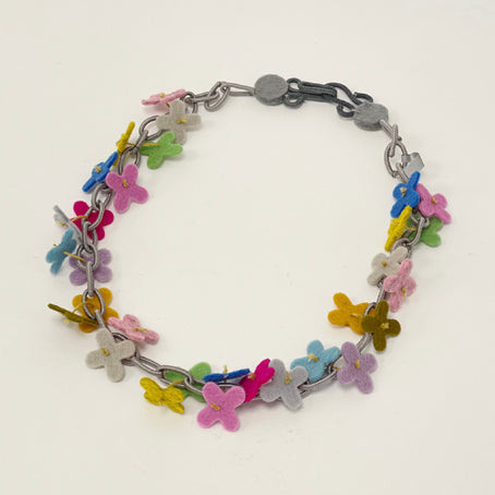 This is a necklace hand made from 100 % merino wool felt flowers which have been strung through a nylon chain. It fastens with a fur hook. This looks stunning worn with a t shirt or jumper.It is extremely light and easy to wear.