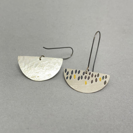 Silver and gold drop earrings. Leaves are gold and oxidised silver. Beautifully hand made and subtly mismatched.
