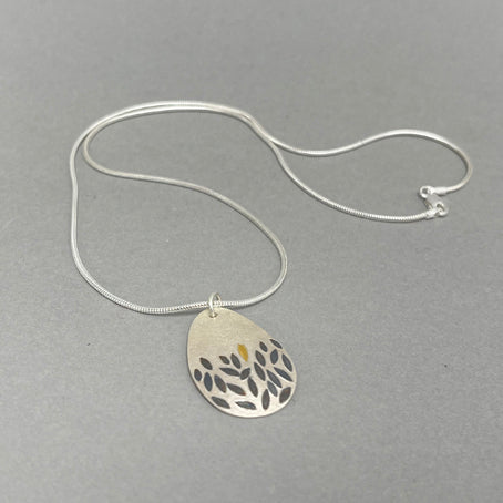Gathered leaves pendant in softly textured silver, leaves are gold and oxidised silver. Beautifully hand made.