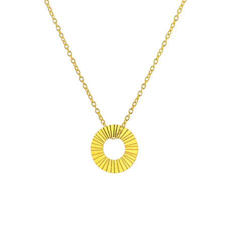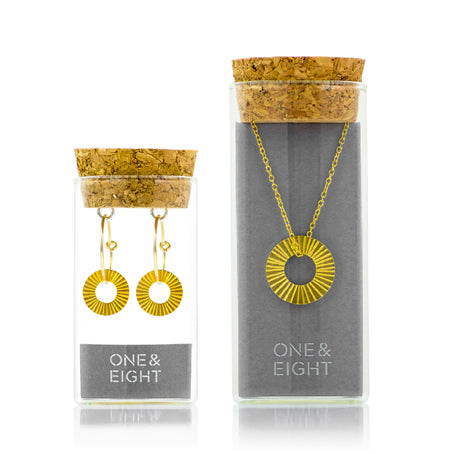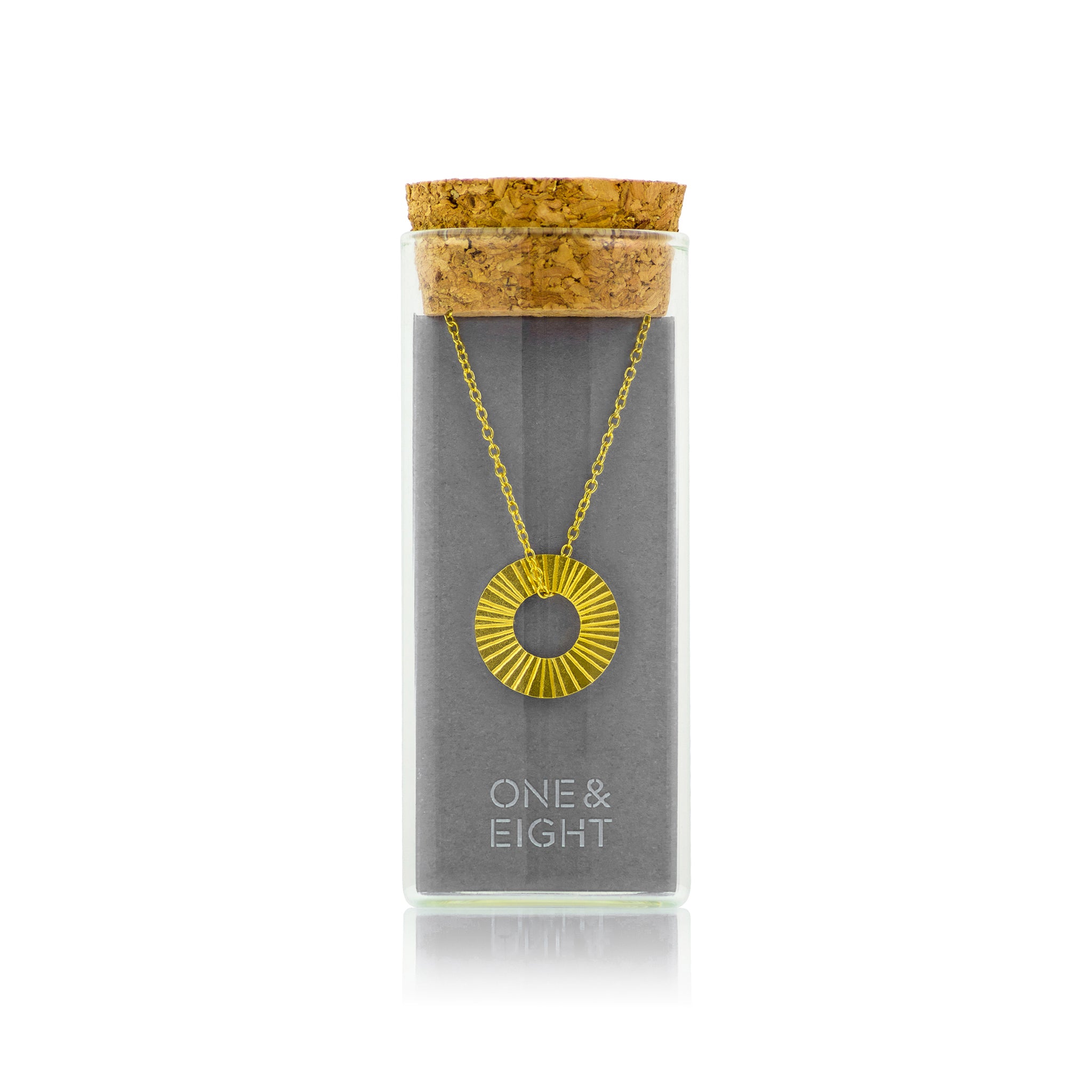 Modern gold plated over sterling silver circular, textured charm on a gold chain, 16" - 18" adjustable gold plated over sterling silver chain. Beautifully presented in a little glass jar with a cork lid.