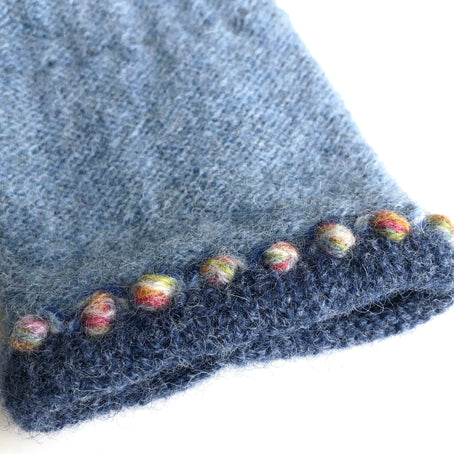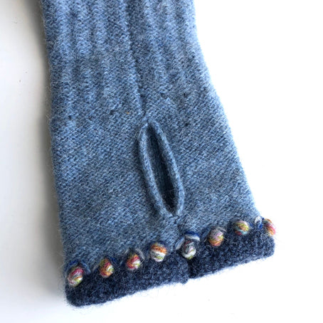 These cosy 2 tone wrist mitts, hand crafted in Ireland are made from lambs wool with embroidered wool details. One size with slot for thumb. Hand wash.