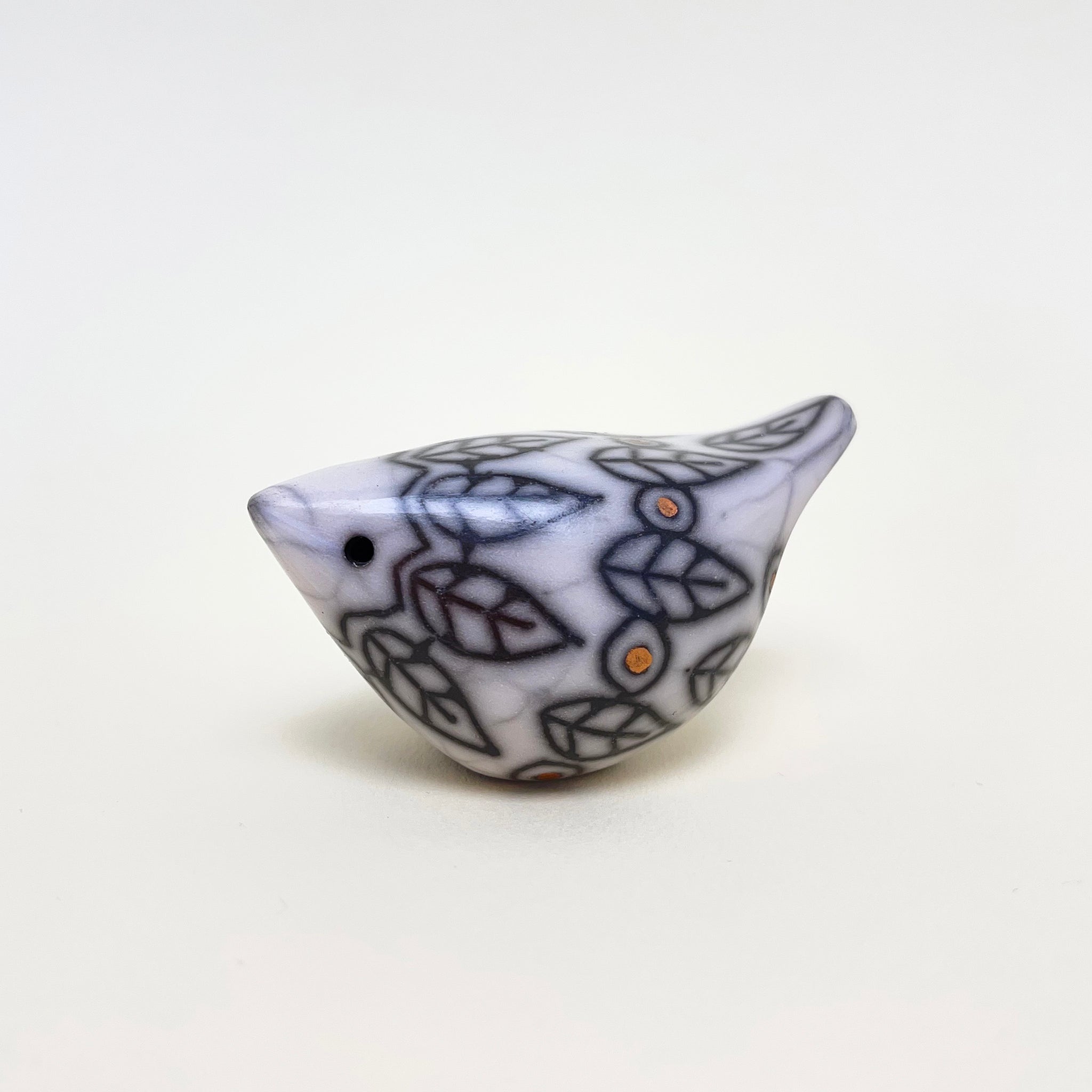 This raku ceramic bird is finished with a feather pattern. Handmade using a stoneware clay. Copper lustre is applied to give details. It is Raku fired outside in a gas kiln. It is then cleaned and polished using clear beeswax.