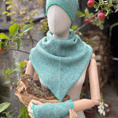 These are hand made in Ireland using luxury yarns. They are super soft and cosy. Made with wool, alpaca, silk and elastan.