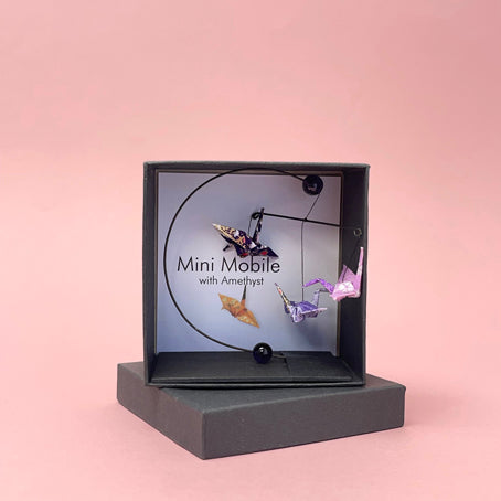 In Japan the crane is a symbol of long life and peace. Each crane is hand folded and assembled with a semi precious bead. This one features Amethyst - associated with humility, sincerity and spiritual healing.