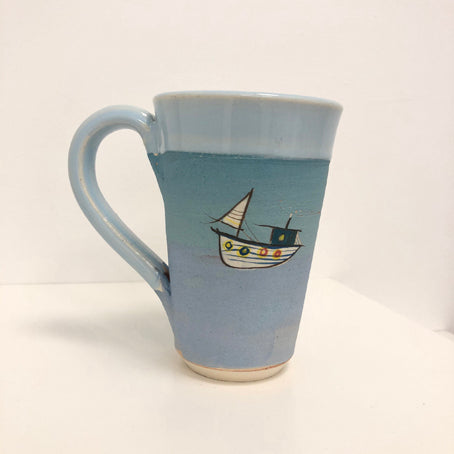 Beautifully hand made ceramic mug, the coloured slip on the clay creates a fabric like feel that echoes the artists embroidered wool and linen textile pieces. This is glazed inside so is fully functional and can be put in the dishwasher.