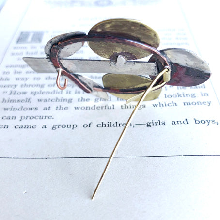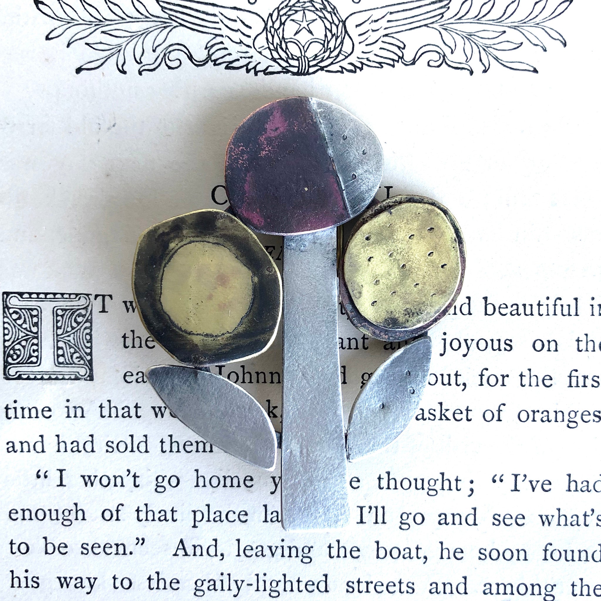 A funky tree brooch hand made in satin finished silver with textured brass and copper details. Hand made brooch pin on the reverse.
