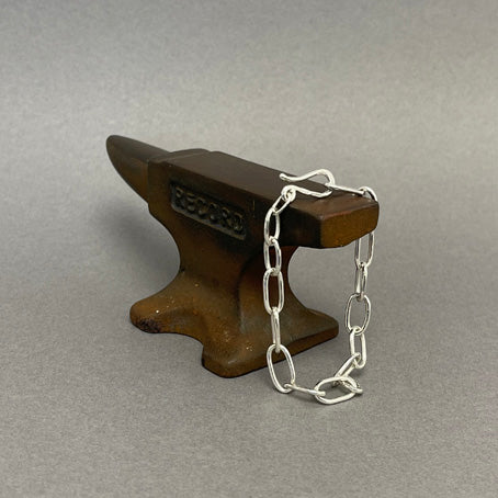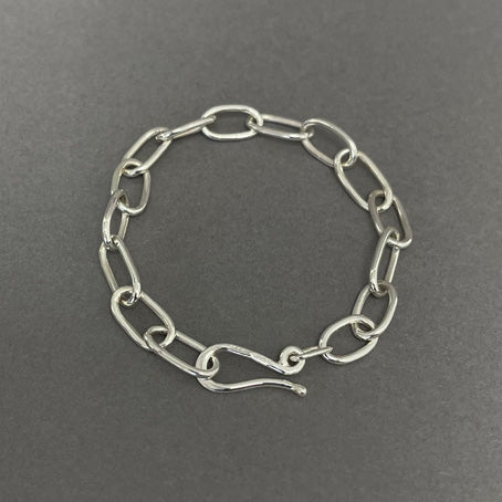 Sterling silver bracelet with each link made by hand. Unique hand made clasp. The bracelet can be adjusted in length as the clasp will attach to any of the links. It has a nice weight and feels lovely to wear. Presented in a gift box.