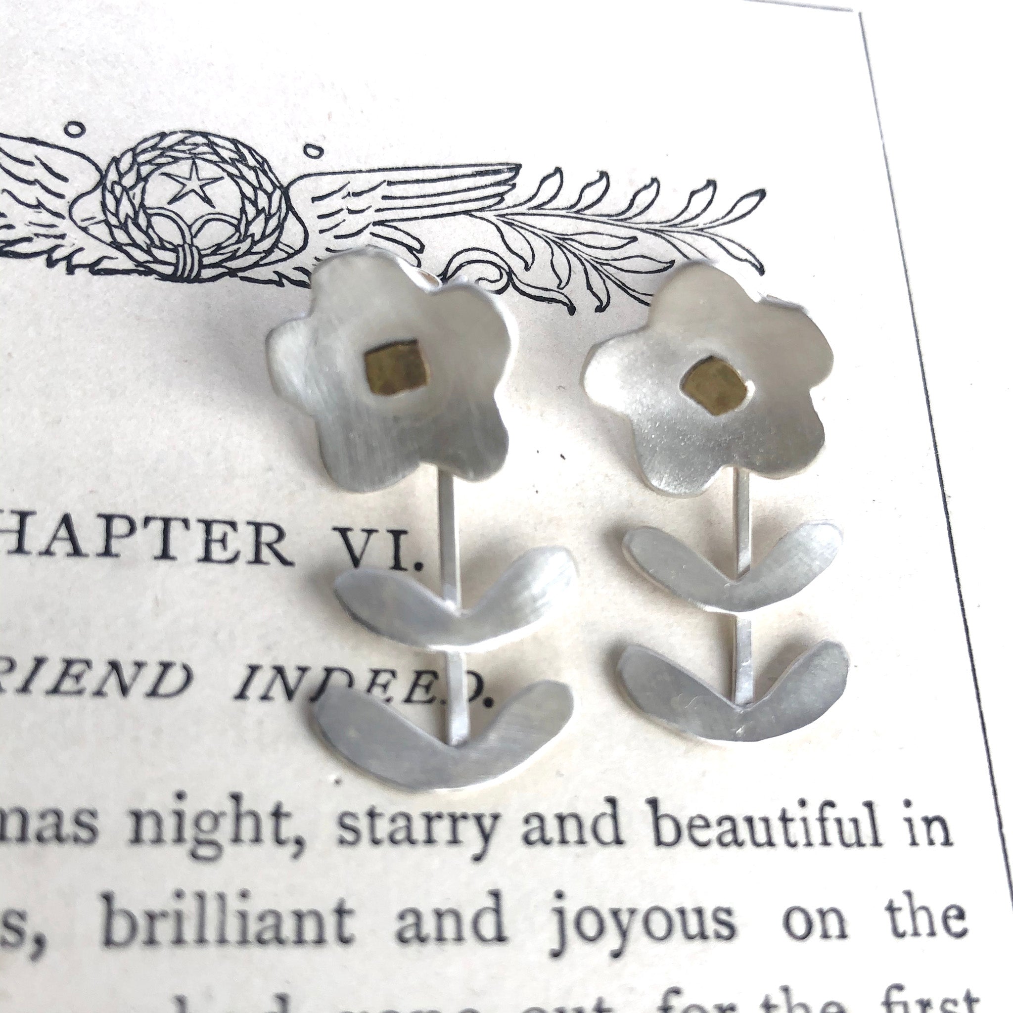 These are hand made satin finished silver earrings with a brass detail. They are unusual as the stem is detachable so they can be worn as a flower stud or with the stem hanging down, see how you feel!