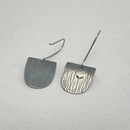 Silver and oxidised silver drop earrings with hand stamped grasses pattern. Beautifully hand made and subtly mismatched.