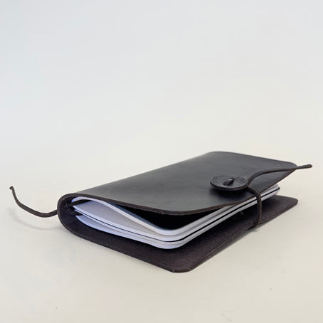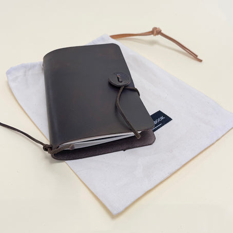 Beautiful, simple leather journal containing 2 note books. The journal closes using a leather button and thong, subtle doghouse brand on the reverse. The journal is supplied in its own linen bag and is fitted with 2 replaceable notebooks - 1 plain sketch book and 1 lined note book.