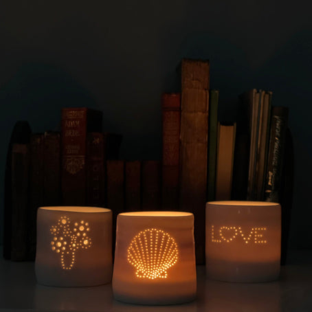 This is a hand thrown porcelain tea light holder. Each one is finished with a rich, glossy transparent glaze and pierced out with an individual design. These look great in any home, place in a sunny window or drop a tea light inside and they'll feel extra cosy in a dark corner.