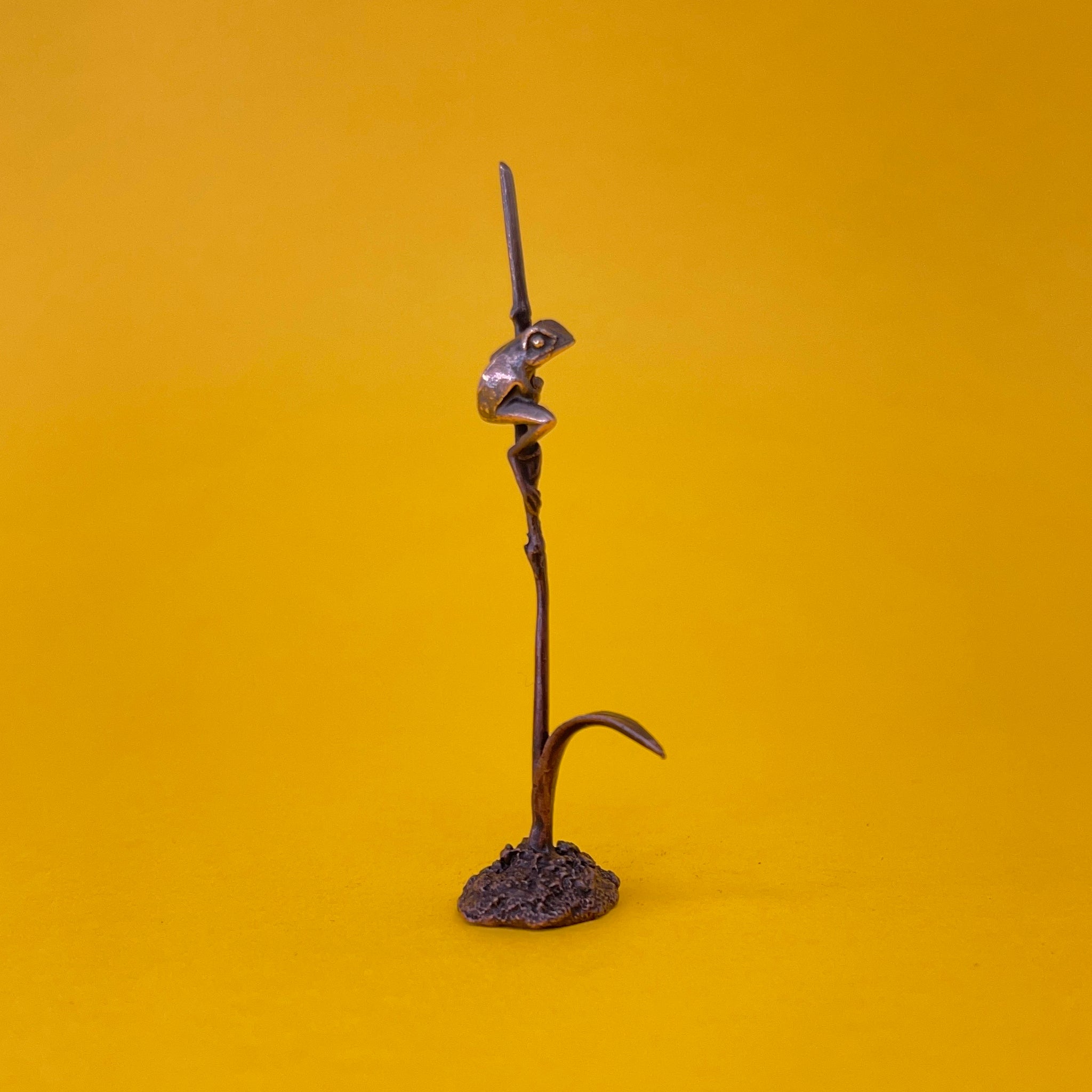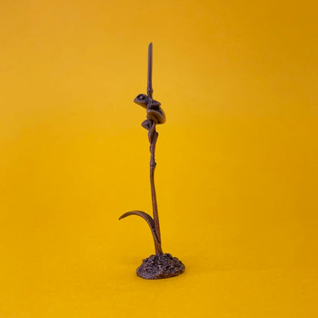 Miniature cast bronze sculpture capturing a tiny little tree frog perched on a twig. Beautifully modelled and lightly burnished. This piece is presented in a small fabric bag.