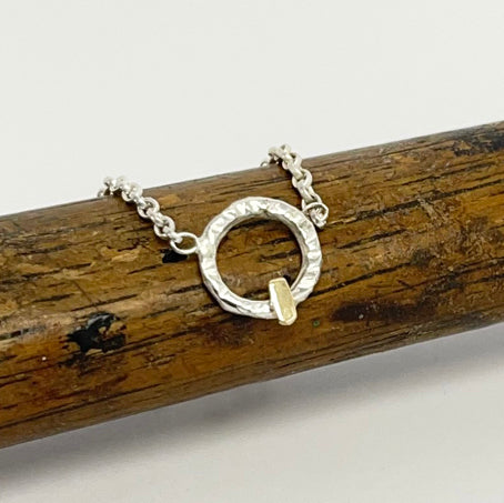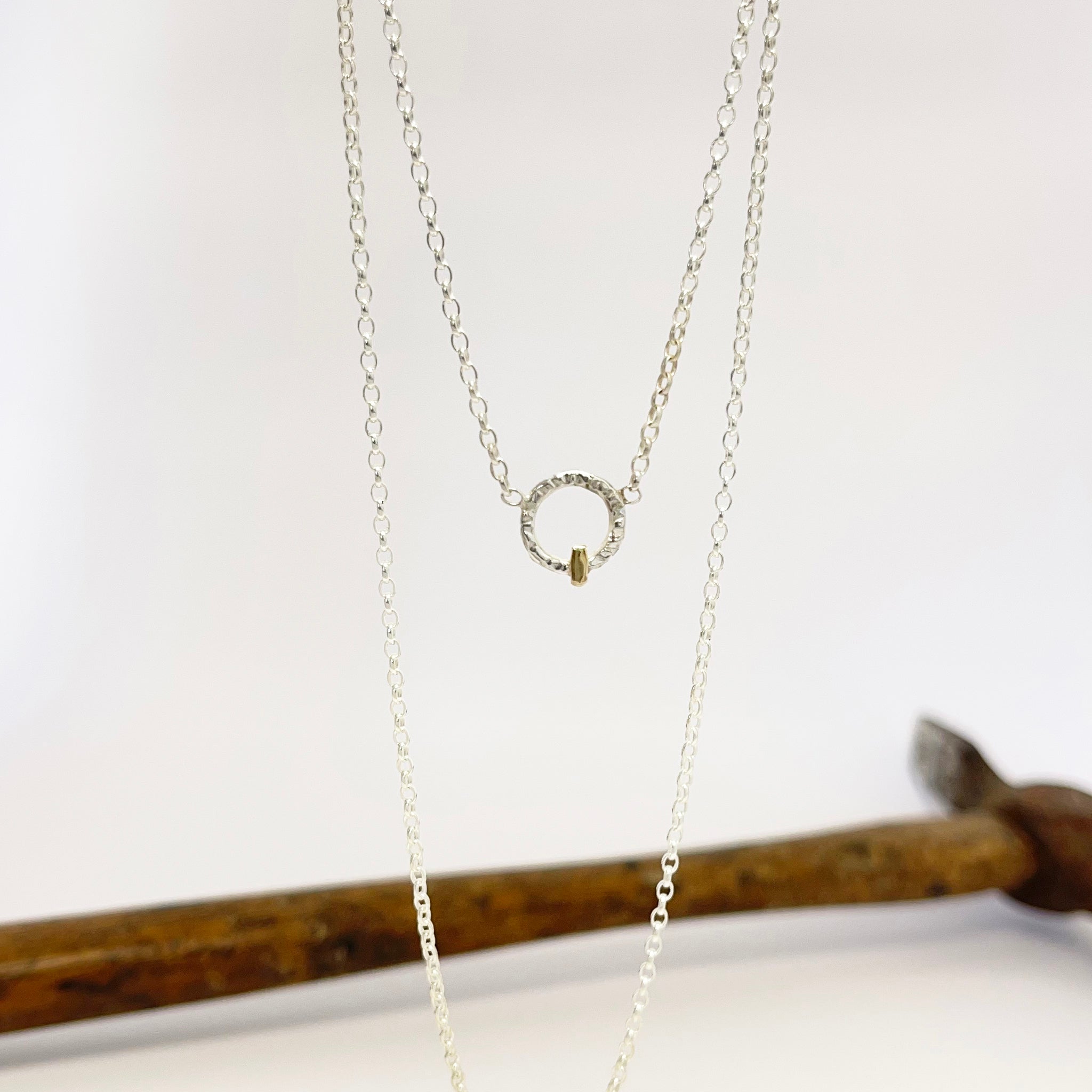 Tiny textured silver necklaces with a gold bar detail. Attached to an 18″ belcher silver chain. Comes beautifully boxed.