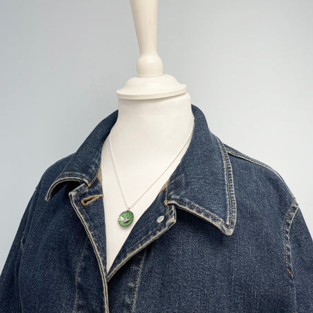 Steel and enamel half dome necklace with heart detail. Comes on an 18" silver belcher chain. Presented in a little box.