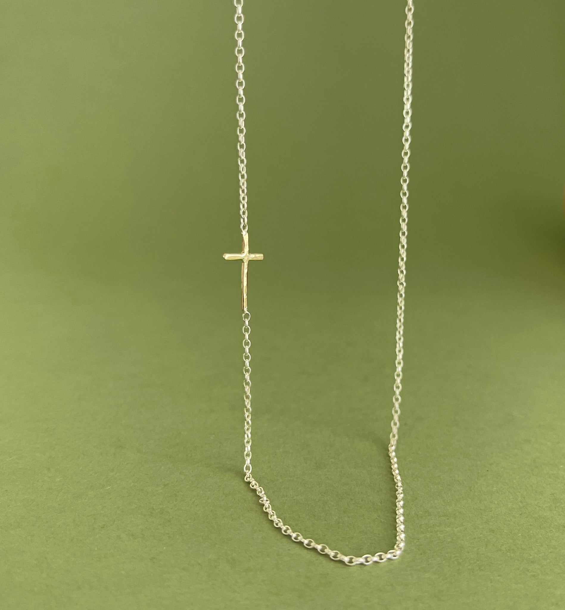 Fine, elegant silver chain necklace with a hand made gold cross detail. The 2 bell chain is 18" long including the cross. The 9ct cross hangs laterally giving a more subtle and unusual appearance.
