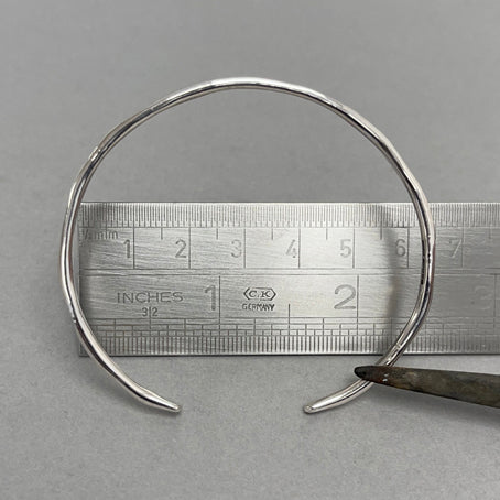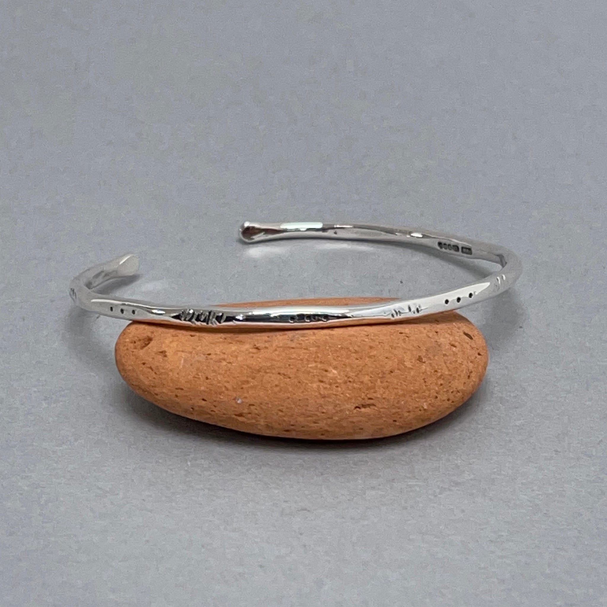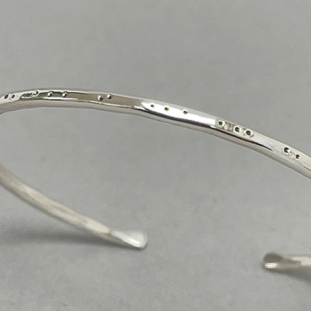 Hand made, sterling silver, textured bangle. Each one is unique, this one has punched dots and a hammered, textured design. Polished finish.