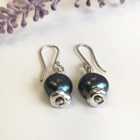 Timeless peacoc pearl and silver drop earrings with hand made silver nugget details. Due to the nature of the freeform pearls there will be slight variations in colour, shape and size. Ear wires are silver, supplied boxed.