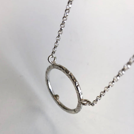 This is an elegant, minimalist necklace made from textured silver ring and small gold dot detail.