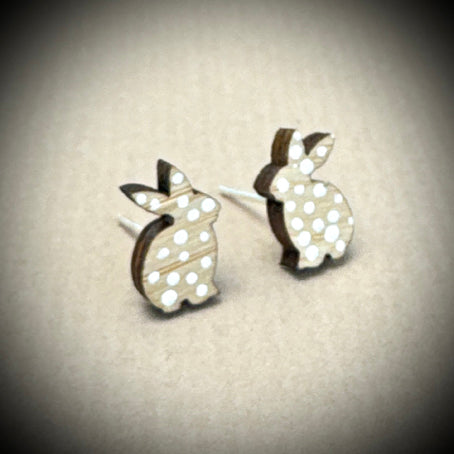 This is the spotty bunny design in a collection of hand painted wooden earrings by The Mountain and Me. The earrings are made from sustainable bamboo and then hand painted with high quality, non toxic, high pigment paints. Finished with a non toxic water based satin varnish. They have  on the back silver plated ear posts and clear silicone backs. These are really tastefully fun, light and easy to wear.