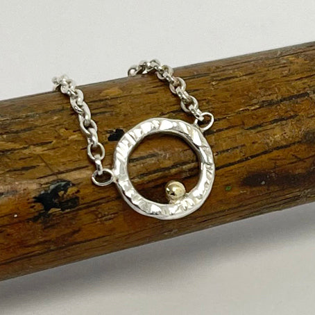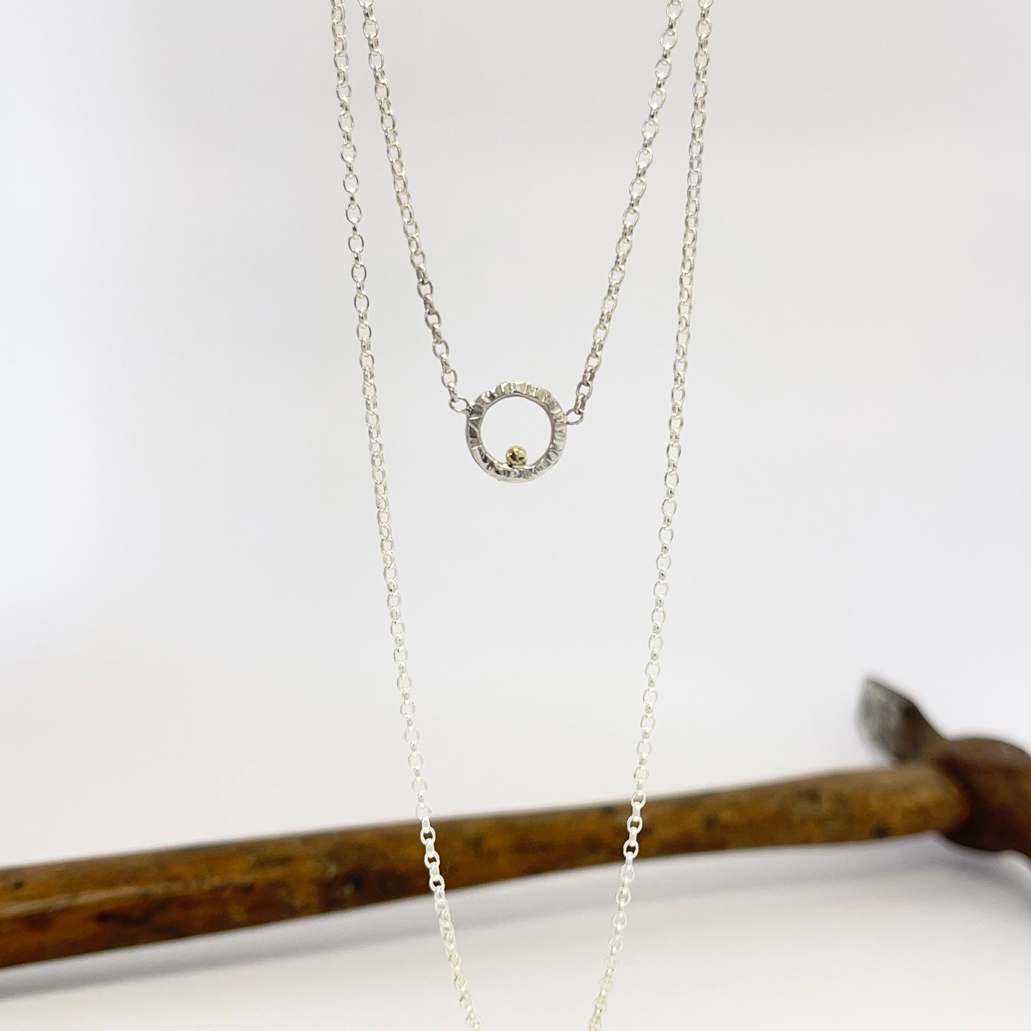Tiny textured silver necklaces with a gold dot detail. Attached to an 18″ belcher silver chain. Comes beautifully boxed.